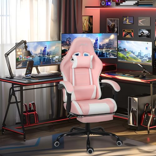 Leopard Gaming Chair with Footrest, Height Adjustable Game Chair with Lumbar Support, Video Gaming Chair for Gaming Room, Living Room and Office – Pink/White